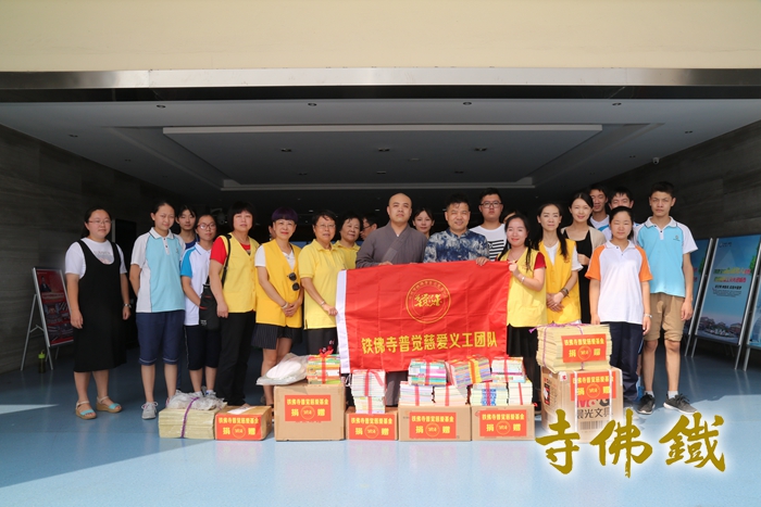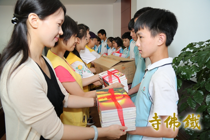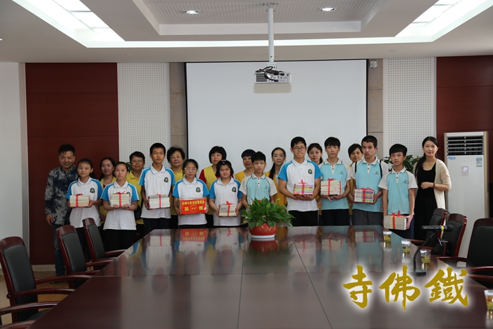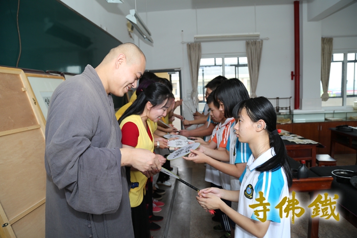 同学们将亲手书写的扇面赠送给恒安法师、义工们