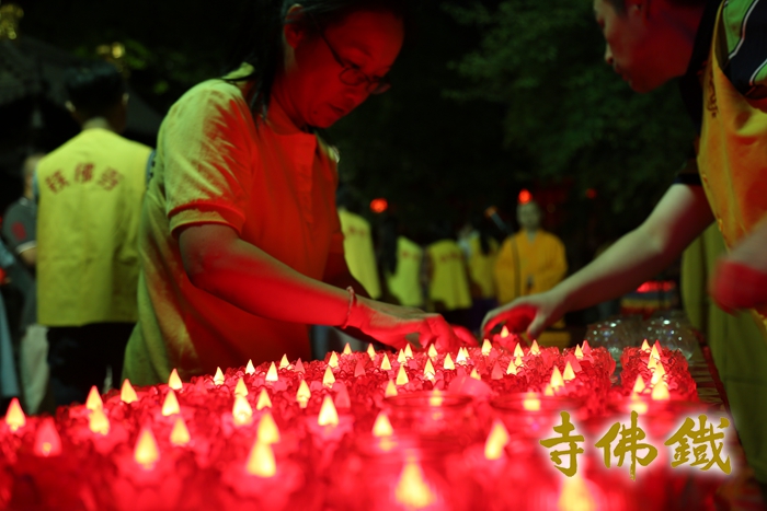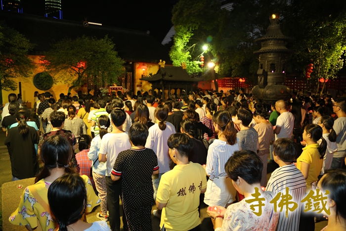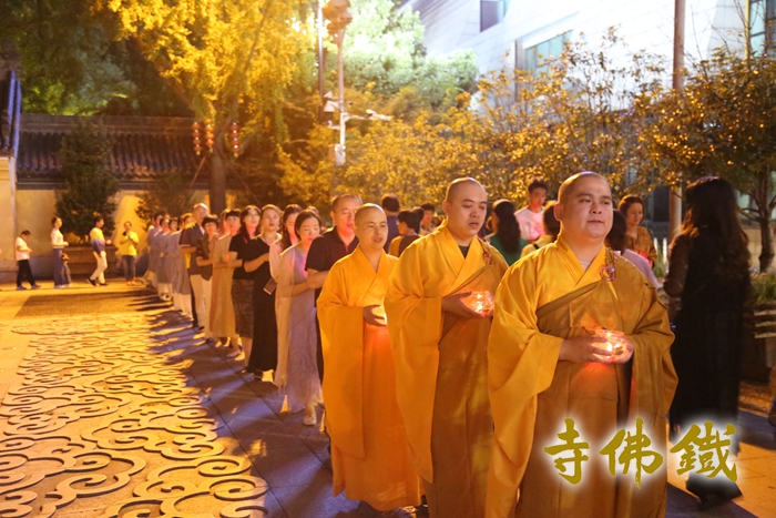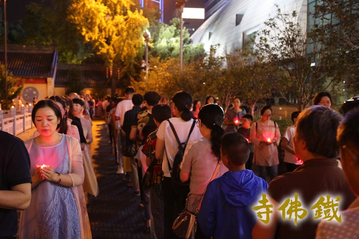2018年9月24日是阖家团圆的中秋之际,铁佛寺举办中秋拜月传灯祈福法会,祈愿世界和平、百姓安康。 《华严经》云:“譬如灯炷,随其大小而发光明,若益膏油,明终不绝;菩萨摩诃萨菩提心灯亦复如是,大愿为炷,发智慧光,照明法界,益大悲油,教化众生,庄严国土,施作佛事,现大威德,无有休息”。在佛教中,灯代表佛法,佛法代表智慧,智慧之光明能破除愚昧之黑暗。“传灯法会”寓意以灯光相续,把佛陀的智慧和慈悲传递到大众心中,带来无限的温暖、希望、祥和、平安和欢喜。 19:30,法会在大雄宝殿前广场如期举行,近四百名信众参加。钟磬梵音中,大众一心祈请月光菩萨光降道场,共同祈愿正法久住,国泰民安。随着“南无本师释迦牟尼佛”念诵声,一盏盏象征光明智慧的酥油灯依次传递每一位善信的手中,大家手护灯火按秩序从大殿出发,依次走出天王殿,于寺前广场右绕三匝,灯灯相续,延绵不绝。同时,沿途不断有路过的市民群众自觉加入到传灯的队伍中,使队伍越来越壮观。依次回到大殿广场后,集体在法师带领下唱诵回向偈,以此传灯功德回报四生九有、八难三途一切众生悉离苦海,同证佛果。 |