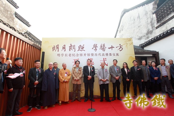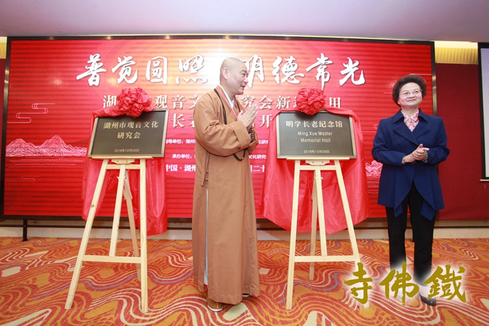 湖州市文联原副主席、市关工委主任沈琪芳、市佛协会第一副会长界隆法师为“明学长老纪念馆”揭牌