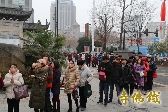 领粥的市民从斋堂排队至寺前广场