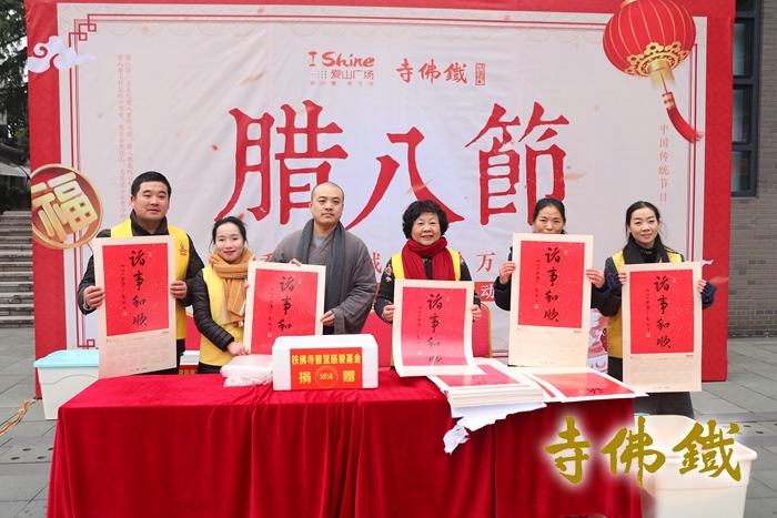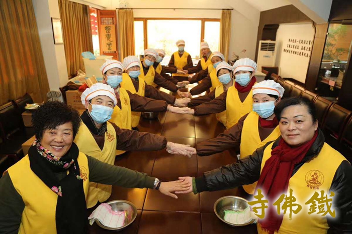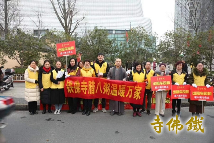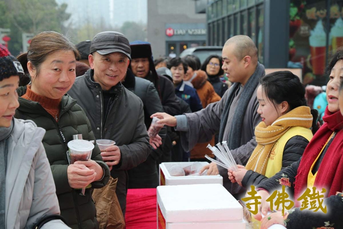 腊八节祈福法会现场 2019年1月13日(农历腊月初八)是传统的腊八节,同时也是佛教创始人释迦牟尼佛成道日。佛陀在他35岁时结束苦行后曾接受牧羊女一碗乳糜的供养,进而恢复精力,于菩提树下打坐,七天后(腊月初八)成道。为纪念牧羊女乳糜之供,佛教传入中国以后,各寺庙逐渐形成在腊八节熬腊八粥结缘给人们的习俗。湖州铁佛寺已连续9年在这天向广大市民施粥,并举办祈福法会。 为使活动举办更加有序圆满,并让更多的群众喝上铁佛寺的腊八粥,与上年度一样,今年铁佛寺腊八粥从前一日即开始熬制并外送慰问。普觉慈爱义工团队在铁佛寺天慧法师、恒安法师的带领下,带着一杯杯热气腾腾的腊八粥相继慰问走访了湖州绿康老年康复护理院、湖州市社会福利中心、夕阳红托老所以及武警、消防、环卫等部门,为他们送去新年的祝福。同时,在腊八当天,为湖城广大出租车驾驶员赠送腊八粥。在爱山广场设立发粥点,让过往市民、游客也能喝上一杯杯热腾腾的腊八粥,分享喜悦和吉祥。 1月13日清晨四点多,义工们不畏严寒,早早地来到岗位上,开始了腊八粥的准备工作。普觉堂中,腊八粥灌装工作有序进行,一筐筐灌装好的腊八粥被送往各慰问地点。封口五时许,前来领取腊八粥的市民已经在斋堂施粥处排起了长龙,义工把热情饱满地把一碗碗热气腾腾,营养美味的腊八粥分派给一位位前来有缘、有福的大众手中,尽显冬日里的暖意和关怀。今年除了在寺中施粥外,还与爱山广场设立施粥点,面向更多市民,让年轻人感受到佛教文化的魅力,既丰富了辞旧迎新的意义,也能带来美满和谐的人生。 本次活动共有200余位义工一如既往参与。布施约两万多斤腊八粥,累计发放逾五万份。 当天铁佛寺还按传统举行佛成道吉祥祈福法会,祈愿世界和平、国泰民安、社会和谐、人民安康。