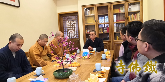 合 影 2019年3月4日,河北省佛教协会副会长、沧州水月寺方丈延参法师与弟子一行参访铁佛寺,湖州市佛教协会副会长、湖州市观音文化研究会会长、铁佛寺住持智根法师热情接待了延参法师一行。 延参法师一行依次在观音殿和大雄宝殿礼佛, 智根法师向延参法师介绍了寺院格局及历史沿革,并着重就寺藏文物唐代经幢、宋铸铁观音、元代碑刻、明代古井、清代铜钟等向客人做了详细的讲解。在稍后的茶歇中,智根法师还介绍了铁佛寺的三个文化,即观音文化、书院文化、公益文化,延参法师谈到,铁佛寺地处闹市,面积不大,但文化底蕴深厚,同时环境清幽,让我们真正领略到江南寺院的独特风韵,尤其是大殿前的那株红梅盛开,满院飘香,让人心旷神怡。 下午四时,延参法师在铁佛寺义工陪同下前往小西街79号,参观明学长老纪念馆、普觉书屋、普觉杂志编辑部、普觉都市禅堂。详细介绍明学长老纪念馆建设情况,并就馆内分区作了详细的讲解,本馆通过大量珍贵实物、图片、文字展示当代湖州籍高僧、净宗泰斗、著名佛学教育家明学长老爱国爱教、弘法利生的一生。延参法师表示,明学长老为佛教事业奉献了毕生的心血,他老人家一生爱国爱教,注重戒律,学修严谨,生活简朴,这样的灵岩道风深深地影响了四众弟子,我们要学习和发扬好明老的崇高精神和高尚品德,为构建和谐社会、实现中华民族伟大复兴作出积极的贡献。最后还向延参法师介绍了湖州观音文化研究会近年来在佛教文化尤其是观音文化领域所取得的理论研究成果及《普觉》杂志的的办刊情况。 |