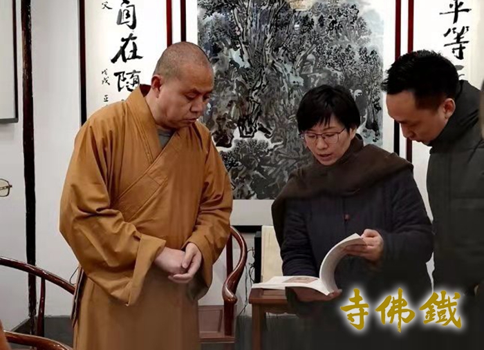 铁佛寺住持智根法师向延参法师介绍寺藏文物及寺院文化建设情况