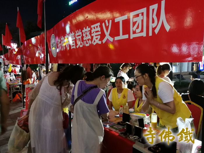 义组织大合影 由市慈善总会、市民政局、市文明办、团市委联合举办的“庆祝新中国七十周年 传播新时代慈善文化”湖州市第五届“慈善嘉年华”于15日在爱山广场墨香坊隆重举行,活动有创历届之最的全市近90家公益团体联袂奉献,提供义诊、义卖、义演、生活服务、趣味互动等五大类共100多项丰富精彩的惠民服务内容,真正的全市慈善公益资源大融合、大集结! 铁佛寺普觉慈爱义工团队天慧法师及12位义工 参与了15:00----20:00的义卖环节。路过的市民朋友纷纷驻足在铁佛寺普觉慈爱义工团队的义卖摊位前,带有吉祥寓意的佛珠手串、精致的祈福挂件、草本香囊等义卖物品极受欢迎,大家踊跃奉献爱心。特别是带有铁佛寺古梅树梅核元素的书签,最受喜爱短时间内被购买一空。爱心人士在现场既选购到合心意的物品,又通过义卖渠道为湖州慈善事业贡献自己的一份力量。天慧师父和义工们为每位咨询的市民、游客耐心解答、介绍相关情况,一次次地合十,祝愿大家诸事顺意。 你我慈善一小步,文明湖州新高度。9月15日从上午到晚间,公益组织和爱心市民共赴一场金秋慈善之约,用爱心和善行,一起续写湖州现代大慈善的美好篇章。 湖州市第五届慈善嘉年华活动募得的善款将全部用于相应的公益领域。 |