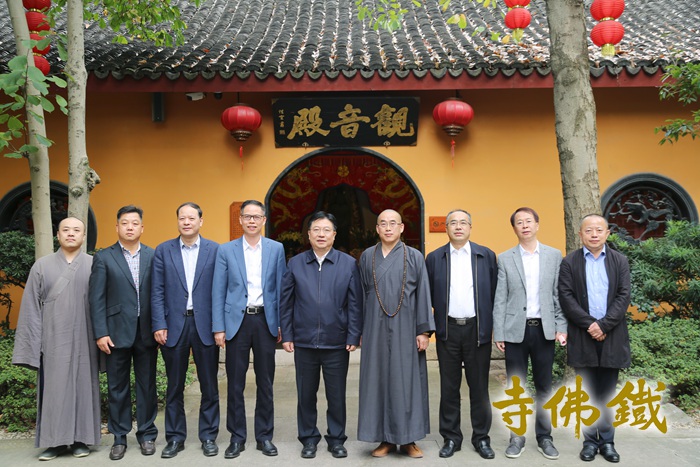 智根法师介绍铁佛寺寺藏文物 观音文化研究会会长、市佛教协会副会长、铁佛寺住持智根法师热情接待了调研组一行,观音文化研究会副会长陆国新和恒安法师陪同参加。智根法师首先向调研组介绍了铁佛寺的历史变革和现如今的寺院管理建设情况,并逐一介绍了寺藏文物和网红古红梅树。在介绍铁佛寺至尊珍宝——宋铸铁观音时,智根法师说到铁观音的微笑包含了世间一切慈悲美好的存在,而且要比西方的蒙娜丽莎的微笑要早了480年,铁观音在2020年的农历二月十九即将迎来1000岁的千年华诞,在此之前将向世人隆重推出千年铁观音的微笑,来展示铁观音的慈悲和美好。调研组领导非常赞叹铁佛寺的景观和环境建设,一步一景,精致雅观,整体环境清幽静谧,禅意隽永,可以称之为沿袭宋代禅院风格的典范。