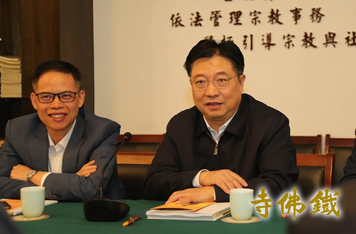 杨建新主席讲话 在听完智根法师的汇报后,杨建新主席对铁佛寺的建设和所取建树都给予了充分肯定和赞叹。他说到,近几年铁佛寺在智根法师的主持下,影响日益深远,寺院香火鼎盛,环境建设和文化建设相得益彰,确实成果显著。铁佛寺能够将佛教文化、观音文化结合中国传统文化和湖州文化走出自己的特色之路,这是非常难能可贵和值得借鉴的,也实实在在的做了很多切实的工作和研究,背后付出了很多努力和心血。佛教文化作为中国传统文化的构成之一,在中国发展的历史长河中发挥了不可估量的作用,希望铁佛寺再接再厉,继续深挖文化的深层意义,加深思路的宽度和厚度,把工作做到深入人心,将观音文化对社会的积极促进作用发挥到最大化。2024年铁观音千年圣诞是个盛大的日子,这是对我们当今太平盛世的最好彰显,要把活动办好,遇到问题要及时与宗教部门协商沟通。