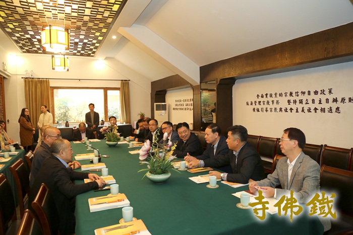 座谈交流会 在随后的座谈交流中,智根法师向调研组一行汇报了铁佛寺近年来在政府各级领导关怀支持下所做的具体工作及所取得的成果,汇报中指出铁佛寺近几年在市委统战部民宗局的领导下,在市佛协的指导下,始终高举爱国爱教的旗帜,围绕中心服务大局,坚持佛教中国化的道路和方向,坚持文化自信,积极弘扬社会主义核心价值观与中华优秀的传统文化,不断加强自身建设,提高法治化水平,抵制商业化不良的影响,践行人间佛教思想,不断地提高佛教与社会主义社会相适应的水平与能力。铁佛寺在弘法利生的工作中,致力于寺院建设、佛法弘扬、慈善公益、文化研究和培养义工这几个方面的工作,不断深挖佛教文化的深层次意义,并结合自身的环境和条件确立了自己的文化理念,即通过挖掘观音文化来弘扬观音精神,发展书院文化来教化众生和培养佛教人才,建设义工文化来服务大众,致力公益慈善文化来践行大乘菩萨道慈悲精神。我们是以印光大师提出的以观音之心为心,以观音之事为事的中心思想来弘扬观音的精神。2013年在我们市市委统战部民宗局的领导之下,成立了观音文化研究会,并于2014年创办了《普觉》杂志,目前已经出刊至第25期,我们以杂志为主导内容和推广名片来推动对观音文化该领域课题的深入研究和探讨,目前该杂志在国内的佛教文化类主流期刊杂志中占有一席之地;同时我们也举办了两期的观音文化学术研讨会,在业内引起很大的重视和反响;2017年我们在西北大学做了太湖观音文化的历史与现状现状的探讨,并与省社科院宗教研究所陈永革教授一起做了课题研究。接下来我们计划在2024年的农历二月十九,铁观音迎来千年华诞之际将举办大型的观音文论坛活动,届时将邀请全国的知名学术专家学者来参加,共同探讨观音文化与当代社会的关系,如何更好的发挥观音文化在和谐社会、促进社会经济发展等方面的积极作用。此外,作为铁佛寺的延展地——小西街79号也发挥了不可估量的宣传作用,通过明学长老纪念馆、观音文化研究会、书画院、都市禅院和普觉书屋五大功能区,积极向社会公众宣传佛教文化。