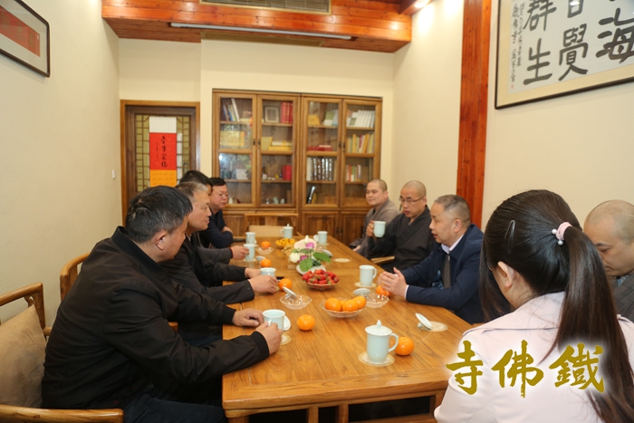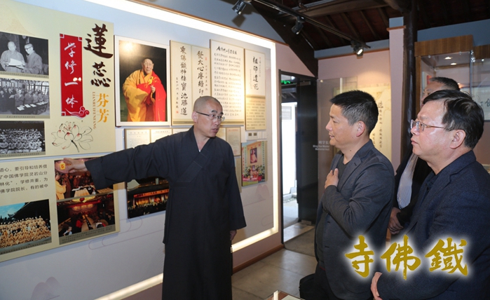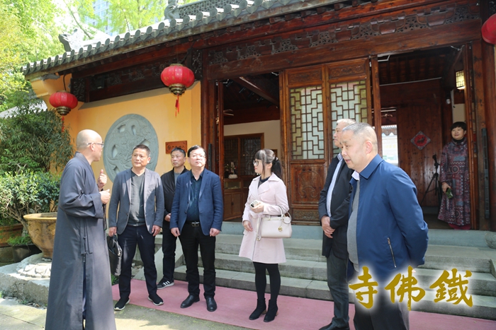 调研过程中,铁佛寺住持智根法师首先向调研组一行介绍了铁佛寺的历史变迁和人文景观,为调研组一一介绍了铁佛寺由唐至清的几件文物至宝:唐代陀罗尼经经幢、宋铁铸观音像、元代赵孟頫碑额、明代宣德古井和清代铜钟,特别介绍了铁佛寺的网红树——六瓣古红梅。 在随后的座谈交流中,智根法师向调研组一行汇报了铁佛寺的文物保护、生态寺院建设和寺院文化建设等方面开展的工作情况。智根法师特别重点深入介绍了铁佛寺的四个文化建设即慈善文化、义工文化、禅修文化和观音文化以及取得的成果,并说到铁佛寺一直致力于将两化建设的思想指导要求融入到寺院的文化建设中去。在慈孝文化方面,铁佛寺成立了自己的慈善基金会,长期致力于大病救助、助学帮困、关老爱幼等方面的慈善公益活动,并受到社会各界的广泛关注和好评;在义工文化方面,铁佛寺除了注重僧众的培养外,还非常重视四众弟子的培养,通过书院的授课学习不断加强义工团队的建设和管理,帮助义工提高修养和素养,所有的义工都是经过统一考核合格的;观音文化研究会是隶属于湖州市宗教局的协会组织,编辑部在小西街,出版的刊物《普觉》杂志每年四期,现已出刊至二十六期。在生态文明建设方面,针对太湖的蓝藻污染情况,铁佛寺发起了太湖公益大放生活动,这也是对习近平总书记两山思想的忠实践行。智根法师的精彩介绍和解读赢得了调研组一行的高度赞赏和认可。 沈林华处长表示当今时代佛教寺院的建设和发展应当立足于文化建设,找准自己的特色并融合社会发展的需要来发挥自己的优势。 局长表示今天此行调研的主要目的就是为了获取文保寺院的恢复建设和发展的经验而来,智根法师的介绍和沈林华处长建议不仅让我们获取了宝贵的经验也给了我们莫大的信心。 最后,智根法师又邀请调研组一行参观了小西街79号,从明学长老纪念馆、观音文化研究会《普觉》编辑部、普觉书画院、普觉禅堂到普觉图书室一一向大家讲解介绍,展示了79号作为铁佛寺的文化延展地所发挥的功能和作用。周云飞副局长非常感谢沈林华处长和智根法师的热情接待,他表示湖州和桐乡相距甚近,又同属杭嘉湖平原腹地,文化同源,应当多往来交流,也真诚邀请湖州的领导和社会人士到桐乡去考察交流。