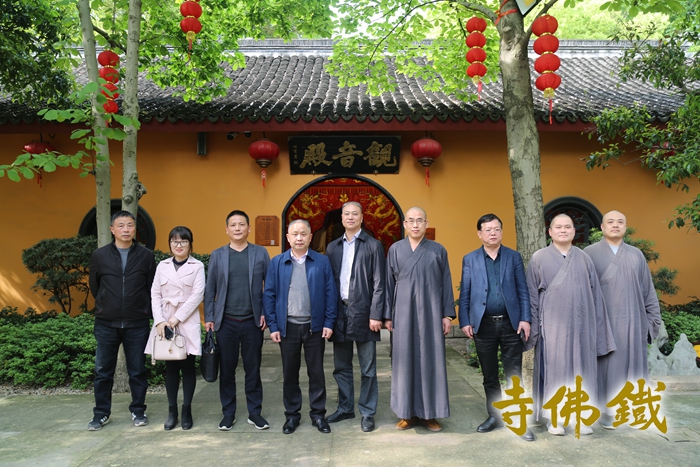 合 影 2021年4月8日下午,桐乡市民宗局副局长周云飞、桐乡市崇福镇党委委员管明华带队的调研组一行莅临铁佛寺调研指导工作,市民宗局二处处长沈林华陪同。观音文化研究会会长、市佛教协会副会长、铁佛寺住持智根法师热情接待了调研组一行,天慧法师和恒安法师陪同参加。