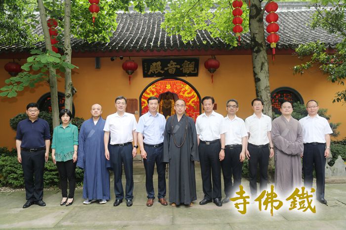 合 影 5月11日上午,省人大常委会委员、民宗侨外委主任委员宋建勋、省人大常委会外事工委副主任何新国率调研组一行莅临铁佛寺考察指导工作,市人大常委会党组书记、主任孙贤龙、市人大常委会副主任曹德平、市人大常委会秘书长、机关党组书记施会龙、市委统战部副部长、民宗局局长鲍鸿等陪同。 观音文化研究会会长、市佛教协会副会长、铁佛寺主持智根法师热情接待了调研组一行,天慧法师、恒安法师陪同参加。智根法师首先向调研组介绍了铁佛寺的历史变革和现如今的寺院管理建设情况,并逐一介绍了寺藏文物和网红古红梅树。在介绍铁佛寺至尊珍宝——宋铸铁观音时,智根法师说到铁观音的微笑包含了世间一切慈悲美好的存在,而且要比西方的蒙娜丽莎的微笑要早了480年。铁观音将在2024年的农历二月十九迎来1000岁的千年华诞,在此之前将向世人隆重推出千年铁观音的微笑,来展示铁观音的慈悲和美好。考察组一行非常赞叹铁佛寺的景观和环境建设,一步一景,精致雅观,整体环境清幽静谧,禅意隽永,可以称之为沿袭宋代禅院风格的典范。寺院庄严洁净的内外环境及规范有序的管理模式也得到了各位领导的赞叹。