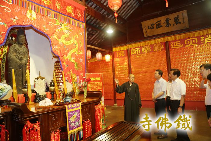 铁佛寺主持智根法师向领导介绍宋铸铁观音
