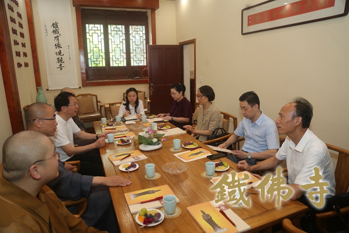 在随后的座谈会中,智根法师向调研组一行介绍了寺院当下的管理建设情况。在弘法利生的工作中,在各级领导的关心和支持下,铁佛寺一直致力于寺院建设、佛法弘扬、慈善公益、文化研究和培养义工这几个方面的工作,不断深挖佛教文化的深层次意义,并结合自身的环境和条件确立了自己的文化理念,即通过挖掘观音文化来弘扬观音精神,发展书院文化来教化众生和培养佛教人才,建设义工文化来服务大众,致力公益慈善文化来践行大乘菩萨道慈悲精神,开展禅茶文化活动和运用禅的思想和理念来化解和调和人心问题,引导大众和谐关系,进而和谐社会。智根法师还向大家特别介绍到,宋铸铁观音即将于2024年的农历二月十九迎来她的1000岁千年华诞,在此之前我们将会举行系列的祝诞活动来为千年观音献礼,向世人展示千年铁观音的慈悲与美好,也让世人都能领略到她融合了宋韵极致之美的风姿。 鲍鸿副部长在谈话中说到,近几年铁佛寺在智根法师的主持下,影响日益深远,寺院香火鼎盛,环境建设和文化建设相得益彰,成果显著大家有目共睹。铁佛寺能够将佛教文化、观音文化结合中国传统文化和湖州文化走出自己的特色之路,这是非常难能可贵和值得借鉴的,也实实在在地做了许多工作和研究,背后付出了很多努力和心血。在向调研组成员重点介绍观音文化的主题期刊《普觉》杂志时,说到这本杂志目前在业界的影响力和所获声誉,鲍鸿副部长倍感欣慰。最后,鲍鸿副部长对庆祝铁观音千年华诞的各项工作规划和进展情况也表示了关心,并给出了相应指示,对千年华诞的献礼既满怀期许,又信心满满。