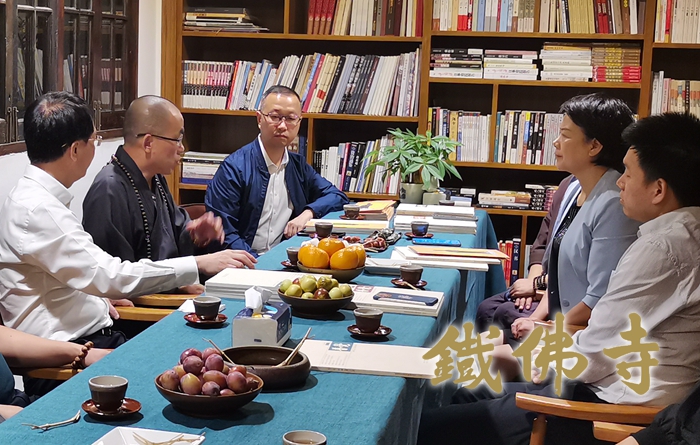 在参观过程中,智根法师向调研组一行介绍了铁佛寺近年来在政府各级领导关怀支持下所做的具体工作及所取得的成果。在弘法利生的工作中,铁佛寺一直致力于寺院建设、佛法弘扬、慈善公益、文化研究和培养义工这几个方面的工作,不断深挖佛教文化的深层次意义,并结合自身的环境和条件确立了自己的文化理念,即通过挖掘观音文化来弘扬观音精神,发展书院文化建设来服务大众,致力公益慈善文化来践行大乘菩萨道慈悲精神。开展禅茶文化活动和运用禅的思想和理念来化解和调和人心问题,引导大众和谐关系,进而和谐社会。