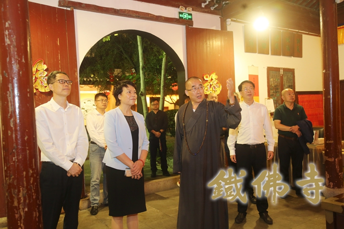 2021年10月12日晚7时,浙江省委统战部副部长、省民宗委主任鲍秀英一行莅临铁佛寺调研,湖州市委常委、统战部部长李上葵,湖州市委统战部副部长、民宗局局长鲍鸿,吴兴区委常委、统战部部长费屹巍,吴兴区委统战部副部长、民宗局局长陆鸣霄陪同调研。 观音文化研究会会长、市佛教协会副会长、铁佛寺住持智根法师热情接待了调研组一行,观音文化研究会副会长陆国新、铁佛寺天慧法师和恒安法师陪同参加。智根法师首先向调研组介绍了铁佛寺的历史变革和现如今的寺院管理建设情况,并逐一介绍了寺藏文物和网红古红梅树。在介绍铁佛寺至尊珍宝——宋铸铁观音时,智根法师说到铁观音的微笑包含了世间一切慈悲美好的存在,而且要比西方的蒙娜丽莎的微笑要早了480年。