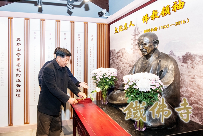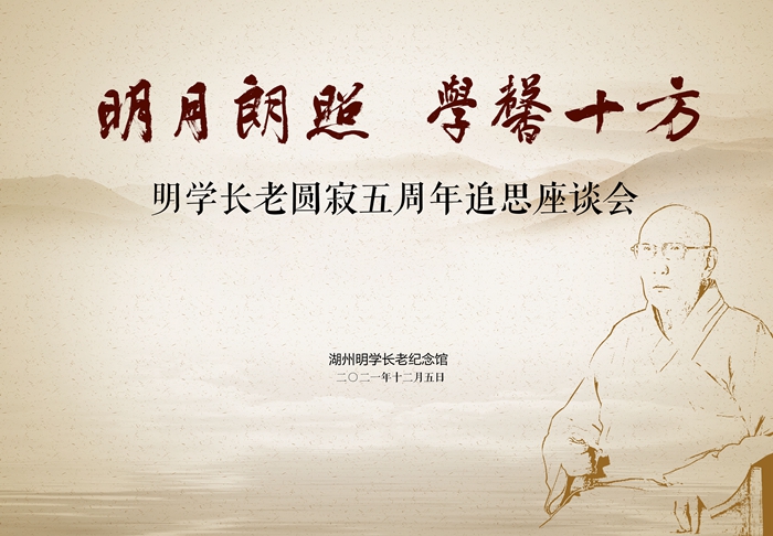 明学长老纪念馆 2021年12月5日下午,明学长老圆寂五周年追思座谈会在小西街79号普觉禅堂召开。本次座谈会由湖州明学长老纪念馆、湖州市观音文化研究会、长兴县佛教文化研究会、湖州市工匠与民俗文化研究会、湖州中学校友会、湖州徳泰恒文化交流中心、湖州周公笔庄联办,座谈会由湖州市工匠与民俗文化研究会会长顾伟民主持。 首先,由湖州市委统战部原副部长蒋晓勇致辞,接着湖州市佛教协会副会长智根法师、湖州市佛教协会秘书长体禅法师、湖州中学原校长沈培健、湖州市观音文化研究会副会长高宝平、湖州市观音文化研究会副会长陆国新、著名学者马青云、著名作家王麟慧纷纷发言,通过各自回忆与明学长老交往中的点滴的方式来共同缅怀一代高僧伟大而朴实的一生。 明学长老一生以佛心为己心,以祖志为己志,为法忘躯,戒行冰清,力振印光大师道场灵岩山寺,秉承印祖道风至今不变,勘称丛林模范,乃当代净土宗泰斗。长老谨记祖训,以印光大师的五条规约作为立寺安僧、修学弘法的根本,并结合时代特点丰富发展,制定了《灵岩山寺共住规约》。 长老以身作则、率先垂范,严持戒律、谨守寺规,重振灵岩山寺十方专修净土道场的宗风,使其成为改革开放后全国汉传佛教三大样板丛林之一,为新时期继承发扬佛教优良传统,加强佛教道风建设、制度建设作出了重要贡献。明学长老的一生,是“不为自己求安乐,但愿众生得离苦”的菩萨道精神的躬身践行者,是育化僧才、泽被后世的勤勉教育者。明学长老平易谦逊,做事踏实,在他睿智的眼里都是大众。明学长老纪念馆有一副明老的“花香散处”。花香散处,正是行善积德,祥瑞自来。同时,明学长老不忘桑梓,心牵家乡佛教事业的建设和发展,不论大小事务始终关心支持,对湖州佛教界发展做出了突出的贡献。明学长老知恩感恩、宁静致远,愿明学长老的教诲如明灯照世,永驻人间。 座谈会结束后,湖州市政协原副主席傅阿五和湖州市委统战部原副部长蒋晓勇为明学长老故居匾额揭幕,随后智根法师带与会人员移步明学长老纪念馆,向明学长老铜像敬献鲜花。至此,本次活动圆满落幕。 参加本次座谈会的还有湖州中学校友会副会长王强、湖州市美术家协会副会长兼秘书长钱慧敏、湖州中学校友会秘书长唐国英、摄影师庄新民、陈晓娟、著名作家王麟慧、马红云、湖州市美协副主席任海荣、湖州市赵孟頫研究会副会长兼秘书长章炳炎、湖州市工匠与民俗文化研究会秘书长徐勇、湖州德泰恒文化交流中心主任郭华纲、中国文房四宝协会副会长周瑾、中国人寿保险湖州分公司副总经理朱彩萍、湖州市工匠与民俗艺术文化研究会理事刘碧忠、书法家倪永泉等,以及明学长老亲属、弟子等共30余人参加。