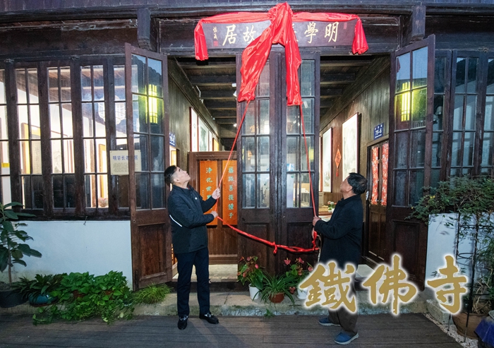 湖州市政协原副主席傅阿五和湖州市委统战部原副部长蒋晓勇为明学长老故居匾额揭牌