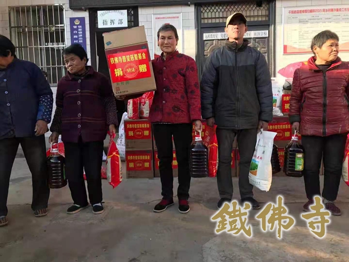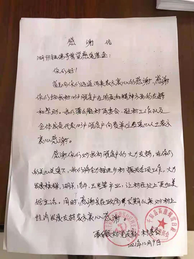感谢信 12月9日,铁佛寺普觉慈爱基金与陕西省宝鸡市的公益约定开启第4次之旅,走进千阳县高崖镇雪白殿村、张家塬镇柳家塬村。2个村庄都位于山区,近几年实现脱贫,村中老人居多,农作物种植是主要经济来源。今夏连续暴雨灾害导致农产品大面积减产,给群众收入带来很大压力,为防止脱贫群众因灾返贫,宝鸡市的爱心人士及千阳县民政局扶贫干部实地走访,切实了解群众目前急需,将情况反馈至普觉慈爱基金。根据实际需求,普觉慈爱基金赠送了棉服、日常小家电并委托千阳县民政局工作人员及时在当地采购取暖煤炭、米、面、油等冬季防寒物资。