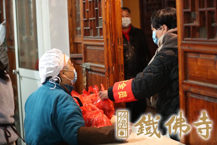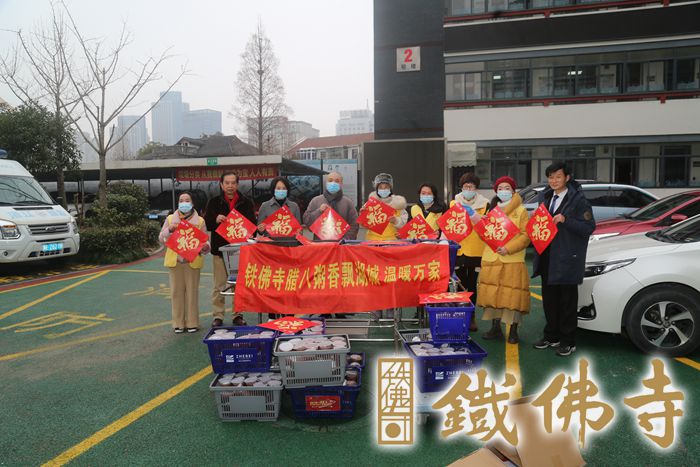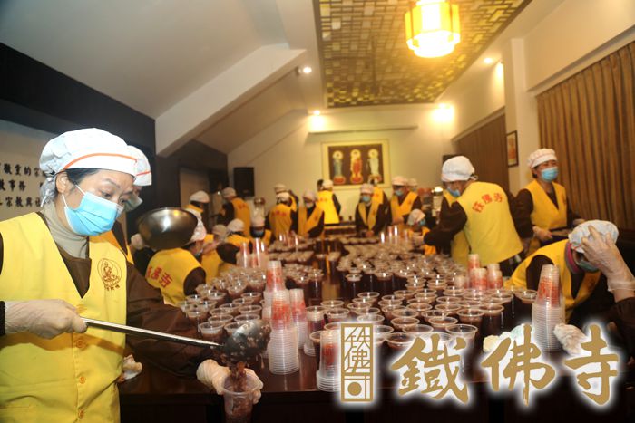 一碗温暖香甜的腊八粥,是湖城人心心念念的味道,是对新年的满满期盼,蕴含着一番美好的祝福。湖州铁佛寺已连续12年在腊八这天举办“香飘湖城·温暖万家”祈福活动,一碗腊八粥,温暖一座城。 腊月初七下午,普觉慈爱义工团队在恒安法师带领下,相继慰问走访了潮音社区、湖州市中心血站、献血屋、湖州绿康老年康复护理院、湖州市社会福利中心、扬帆自闭症康复中心以及武警、消防、环卫等部门,为他们送去新年的祝福,分享喜悦和吉祥。 腊八清晨四点多,义工们不畏严寒,早早地来到岗位上,开始了腊八粥的准备工作。普觉堂中,义工居士们将熬制了整整一夜的腊八粥有序的进行封装工作,腊八粥被送往各公益慰问点。 因受疫情影响,铁佛寺的腊八节活动与以往相比也有了很多新变化。今年,铁佛寺严格按照疫情防控要求熬制和派送腊八粥,并开通网上预约功能,尽量减少人员聚集。寺院多处设置“一米线”保证安全距离,山门处安排义工值班,对信众、市民进行测温、检查健康码和行程码以及实名登记,对未佩戴口罩的市民及时赠送口罩。每位义工上岗前也必须经过体温检测、出示健康码等程序,合格后方可开始上岗,并全程佩戴口罩。 此次共熬制腊八粥三万多斤,累计发放逾六万份。铁佛寺聚集社会力量,共同弘扬传统民俗文化,腊八文化的影响一年浓过一年。从寺院到社会,整个湖城以腊八粥为纽带,互相勉励,共祝新年。我们共同祝愿2022年,世界和平,国泰民安,诸事祥和,福虎献瑞!