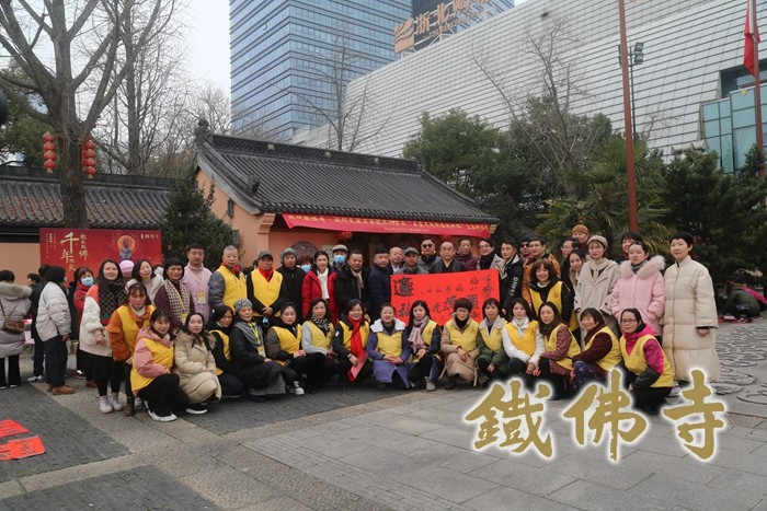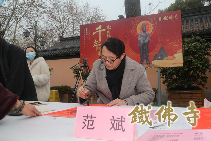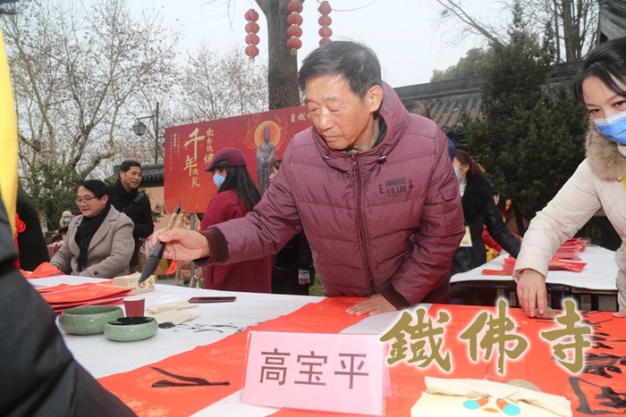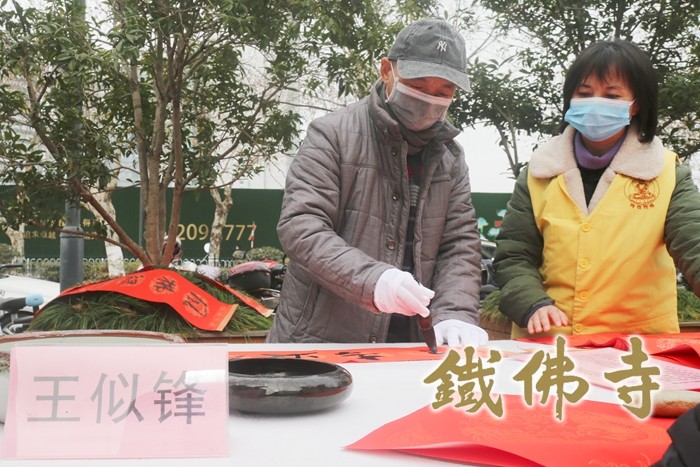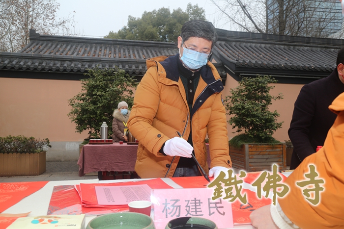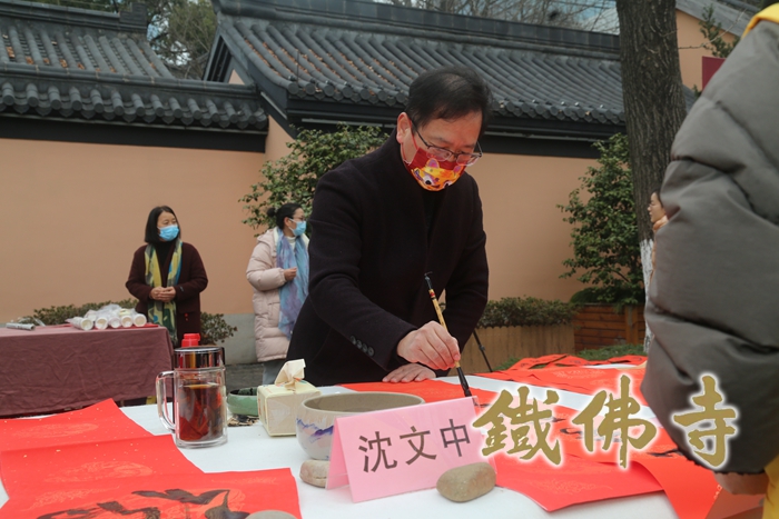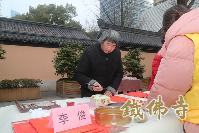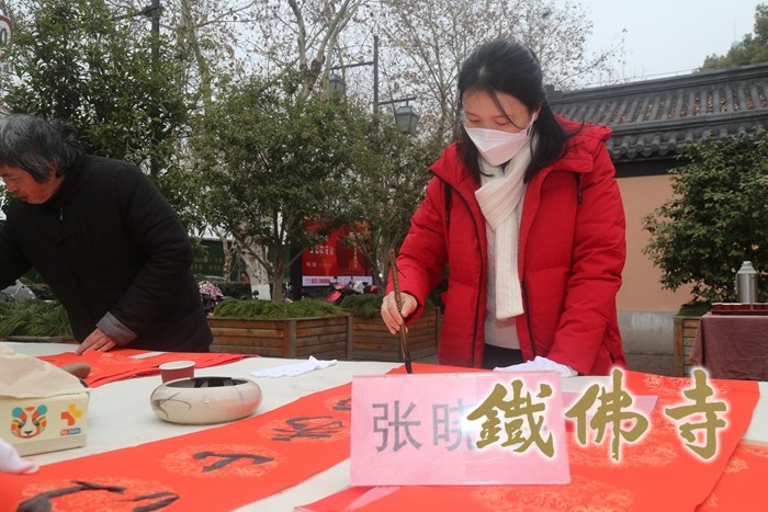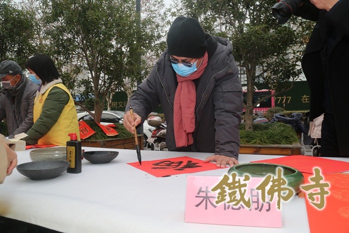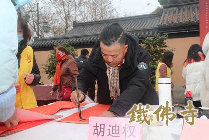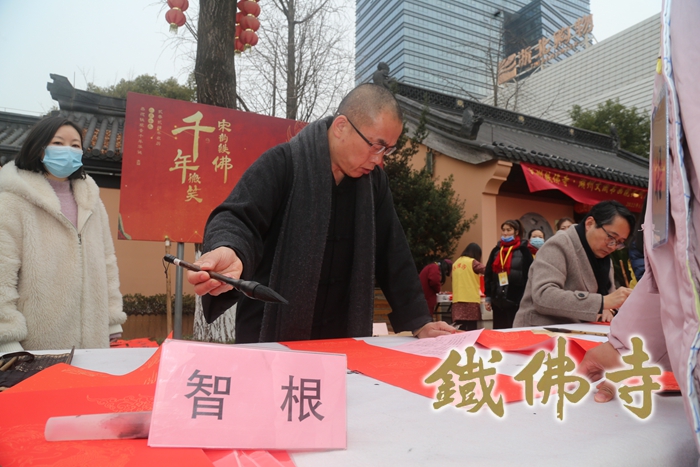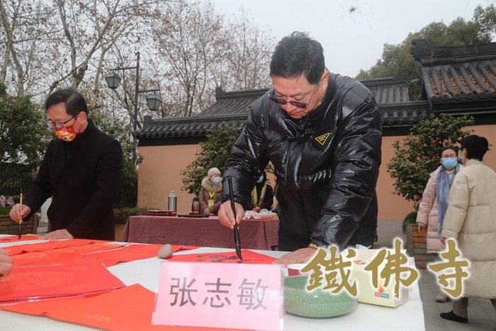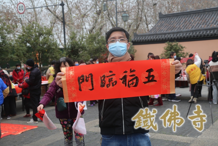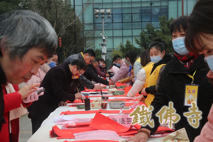 合 影 2022虎年春节即将来临之际,为弘扬中华民族优良传统,营造吉祥红火的春节喜庆氛围,由湖州铁佛寺、湖州文澜书画院共同发起,浙江佳成和合建设有限公司协办的壬寅年“福虎献瑞”写春联送祝福活动于2022年1月17日上午举行。湖城著名书法家齐聚铁佛寺广场,现场挥毫为广大市民信众写春联,把吉祥祝福送到千家万户。