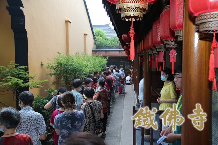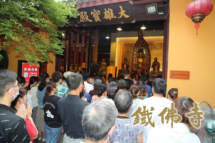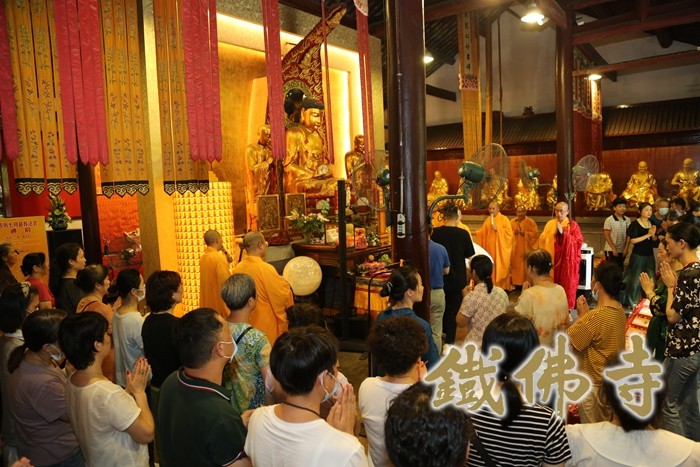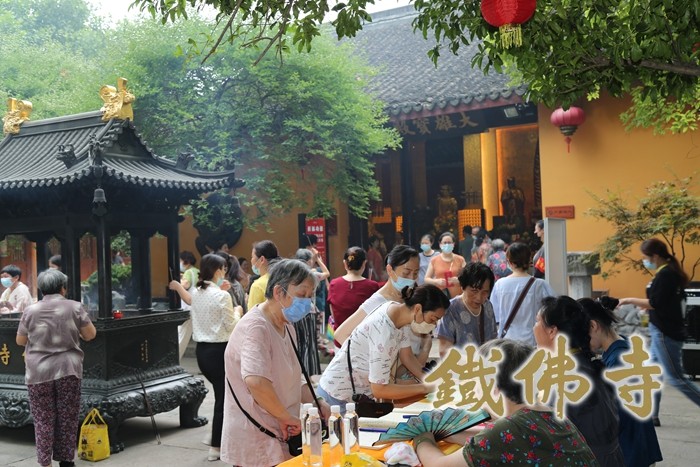 道场清净 法会庄严 信众欢喜信受 经典记载观音菩萨在久远劫以前就已成佛,佛号正法明如来。因大悲愿力,要安乐利益众生,所以“倒驾慈航”现菩萨相,来此娑婆世界弘扬佛教。2022年7月17日,农历六月十九恭迎观世音菩萨成道吉日,在此日念佛、诵经、供养三宝、放生犹为殊胜,具大功德。 每年的农历六月十九,湖州铁佛寺都会隆重举行观音菩萨成道日祈福法会,四众弟子共同祈愿佛日增辉、法轮常转、世界和平、国泰民安。 从凌晨4:30寺院山门开启之始,进入寺院上香、供灯、虔诚祈福的香客络绎不绝的从各地赶来。铁佛寺的普觉义工们也早已准备就绪,扶老人上下台阶、引导维序、安全警示等工作在晨钟声中有条不紊地展开,尽心尽责,欢喜承担。铁佛寺现虽已恢复开放,但寺院的疫情防控措施丝毫未作放松,在山门处值岗的普觉义工们有条不紊的引导香客测量体温、查验健康码、填报信息和佩戴口罩,在人流高峰期进行有效的限流和分流措施。负责巡逻的义工不时喷洒消毒水,给等候礼拜供养菩萨的香客挤压免洗消毒洗手液清洗双手,并提醒大家保持安全距离。普觉义工们贴心周到的服务获得了香客们的一致称赞,也给大家带来了安心和放心。 上午8时左右,进香人流量开始进入高峰。虽然时值盛夏,酷暑难耐,但广大信众前来进香的热情丝毫没有减退。寺院内烟火缭绕,但在义工的维序工作下,依旧井然有序、祥和安宁、庄严清净。为防止中暑等意外情况发生,寺院还准备了大量的防暑药品,同时在观音殿前设置普茶台免费提供凉茶和铁佛寺矿泉水,让歇脚的信众有暂时休息的地方。 上午十时半,大殿内的祝诞普佛法会正式开始。法师以大悲咒加持之杨枝净水洒向大殿内外数百香客信众,大众以共沾法益而欢喜。现场秩序井然,众情肃穆,双手合十,以至诚之心称念观音菩萨名号,祈求观世音菩萨慈悲加持护念,祈愿世界和平、兵戈不起、灾祸消弭,一切众生脱离苦海,同享法乐。