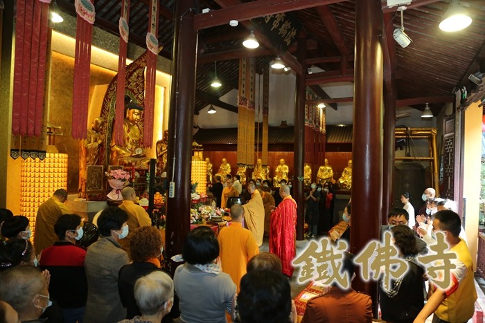 时至10:30,祈福法会在悠扬的梵呗声中拉开帷幕,大殿内钟罄和鸣,与会信众欢喜祥和,道场庄严清净,幡花庄严,香云缭绕,信众与法师们一起诵经祈福,愿此香花云,遍满十方界。一 一诸佛土,无量相庄严。具足菩萨道,成就如来香。观世音菩萨出家殊胜日,铁佛寺两序大众普佛祈福,纳福添寿,共沾法喜。 十二时许,祈福法会圆满,以此法会功德祈愿天下无灾,大地清宁。仰仗观音菩萨巍巍功德之力回向国泰民安、风调雨顺,与会大众法喜充满,同获法益