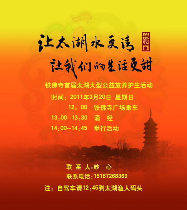 “让太湖水更清,让我们的生活更甜” ----铁佛寺首届太湖大型公益放养护生活动 关爱太湖,让太湖的水质进一步得到改善,是与湖州人民生活质量息息相关的重要举措,随着政府水环境治理的力度不断加大,太湖的水质已在逐渐变好,为了进一步更好的美化太湖,维系生态平衡,放养“食藻鱼”是控制蓝藻爆发的有力措施。大家都希望为净化太湖、改善水质、美化生活贡献一份力量,这次举行的“让太湖水更清 ,让我们的生活更甜”大型放鱼护生活动是铁佛寺携手很多爱心人士及企业,共同开展的一次社会性慈善公益活动。 在太湖中放生鱼苗既合乎佛教的放生护生的理念,又对水质的净化、整个太湖生态环境的改善能起到非常大的作用,增加我们保护生态环境的社会参与意识,美化太湖,造福子孙后代。更赋予维持生态平衡、弘扬生命价值理念、追求生活幸福的内涵,体现了科学发展观和建设生态文明的要求。 活动时间:3月20日 星期日 12:00 铁佛寺广场乘车13:00-13:30 诵 经 14:00-14:45 举行活动 活动地点:太湖渔人码头 活动内容:1、由市相关领导讲话 2、铁佛寺监院智根法师致答谢词 3、组织义工于太湖投放鱼苗 注:自驾车请12:45到太湖渔人码头 铁 佛 寺 2011-2-28