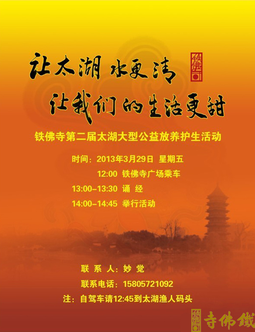 随着百姓环保理念的不断提升保护,全国上下对水资源的关注力度也越来越大。湖州太湖水环境在市政府的重视下,在农业相关部门有效治理下,放养食藻鱼让太湖水质在不断改善。为了使湖州山清水秀、天蓝湖清,让湖州的生态环境越来越好,铁佛寺将于3月29日下午2:00携手爱心企业及人士与有关部门一起于湖州渔人码头举办“让太湖水更清 ,让湖州城更美”大型公益放生活动,共同为太湖水质的进一步改善再作贡献。 在太湖中放养食藻鱼类对太湖水质的净化、改善具有明显的作用,同时通过放养活动增加大众保护生态环境和水资源的意识,弘扬生命价值的理念,提升百姓生活质量,为美丽湖州建设贡献力量。