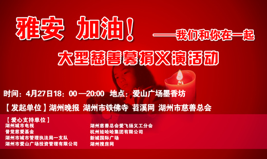 "雅安,加油!我们永远和你在一起"。湖州晚报、苕溪网、慈善总会、铁佛寺共同发起大型募捐义演活动将于本月27日晚18:00一20:00在湖州爱山广场墨香坊举行。我们虽然跟雅安远隔千里,但我们与雅安人民的心永远连在一起,雅安坚强,雅安挺住!我们愿尽我们微薄之力,帮助雅安人民度过难关。愿有缘人届时共聚爱山广场,共同来为雅安募捐,为雅安祈福!(另:铁佛寺将于本月27日下午14:00一16:00举行法会,为生存者祈福,为遇难者超度,欢迎随喜参加!)